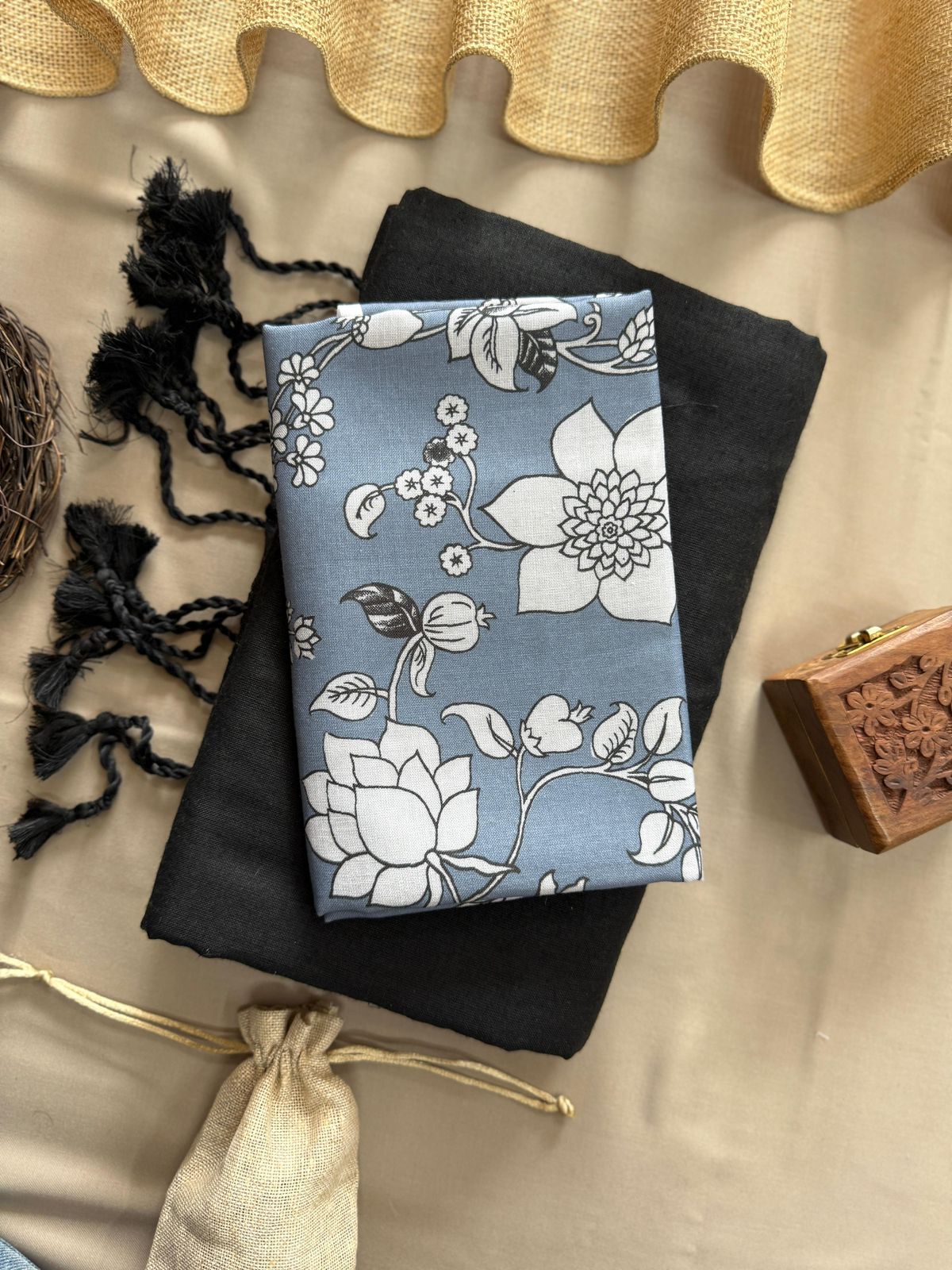 Black Handloom Cotton Saree With Flower Printed Blouse