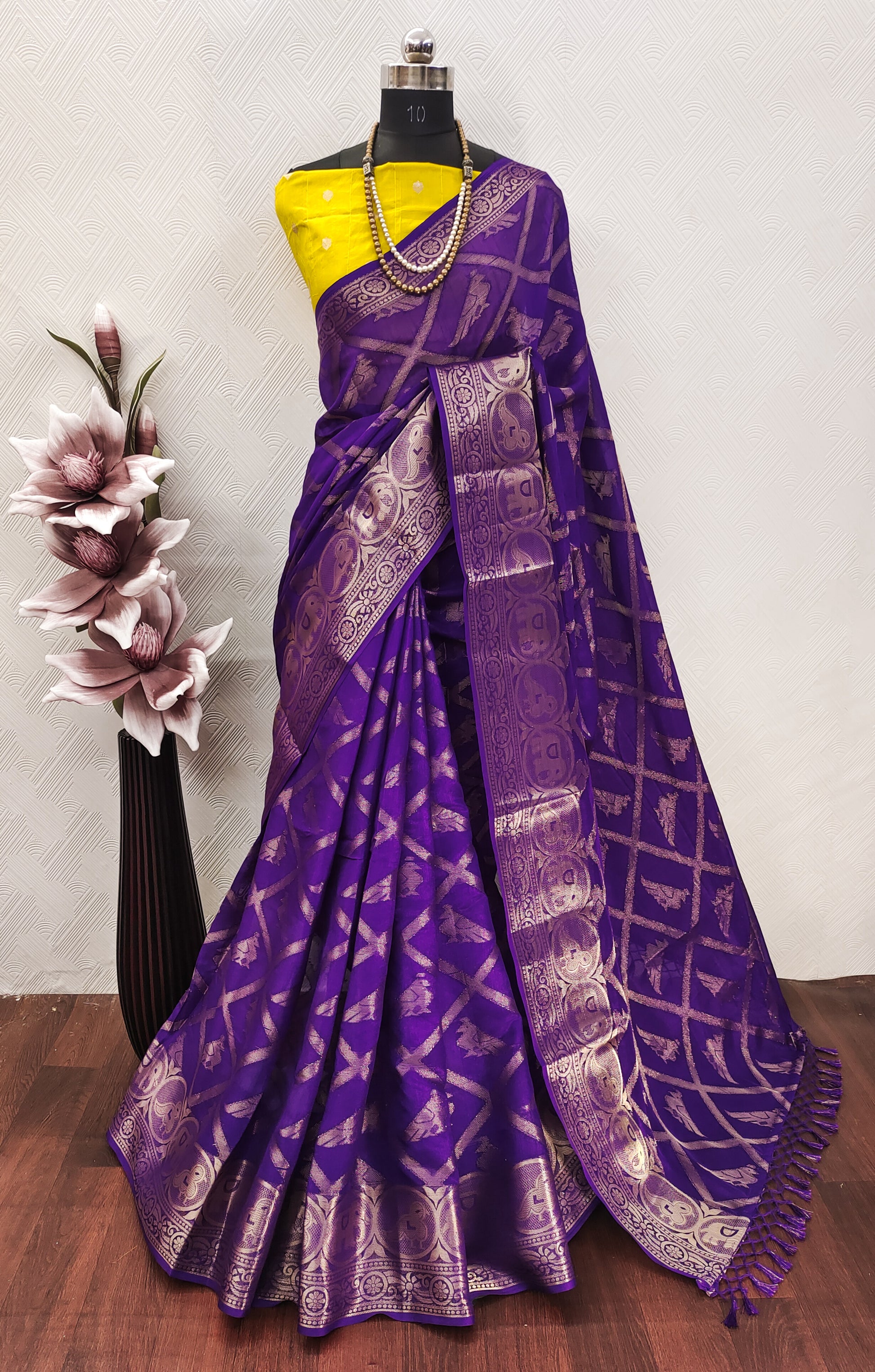 Most Trending Viral Viscose Silk Dark Purple Saree With Weaving Zari Border