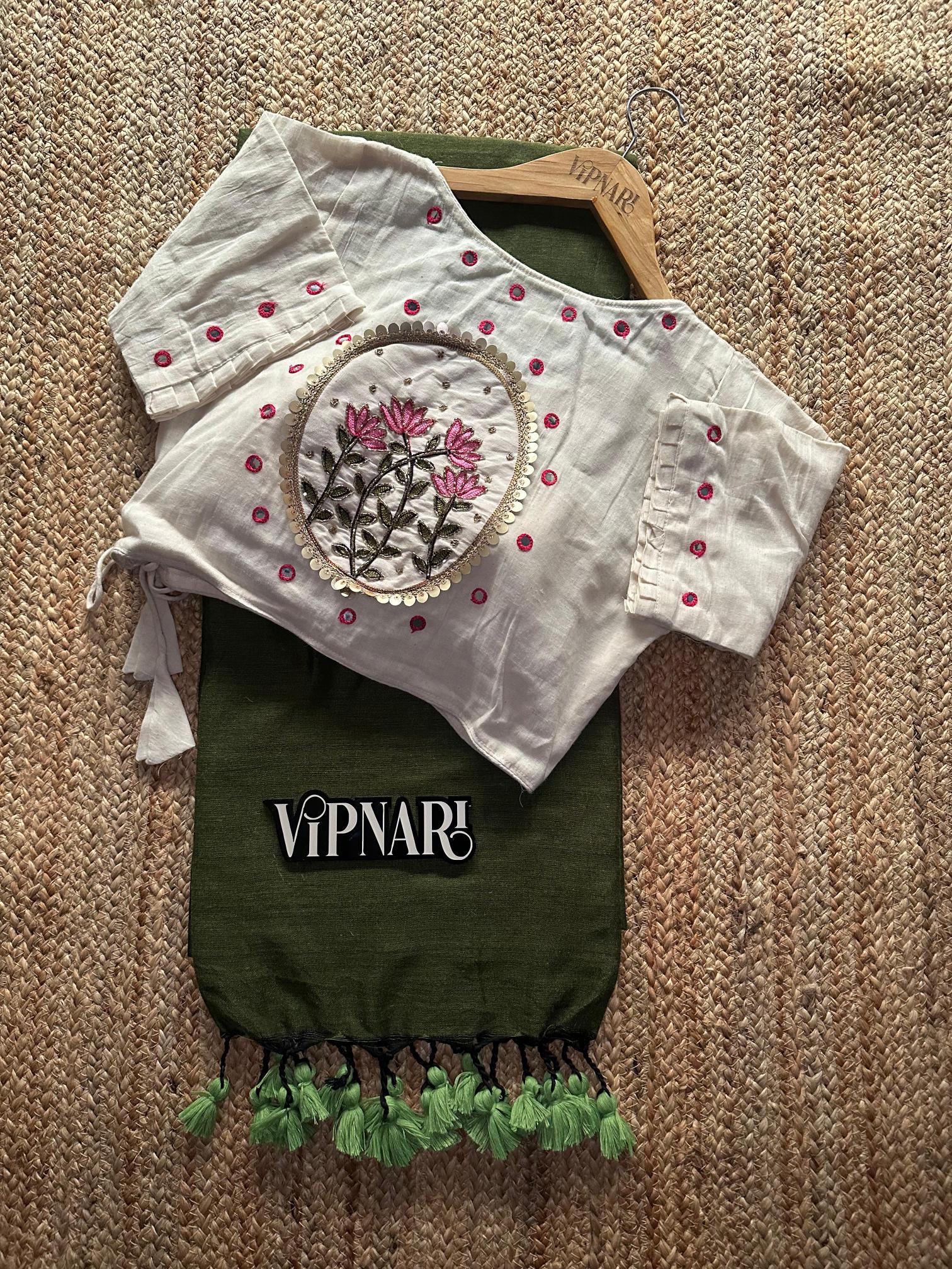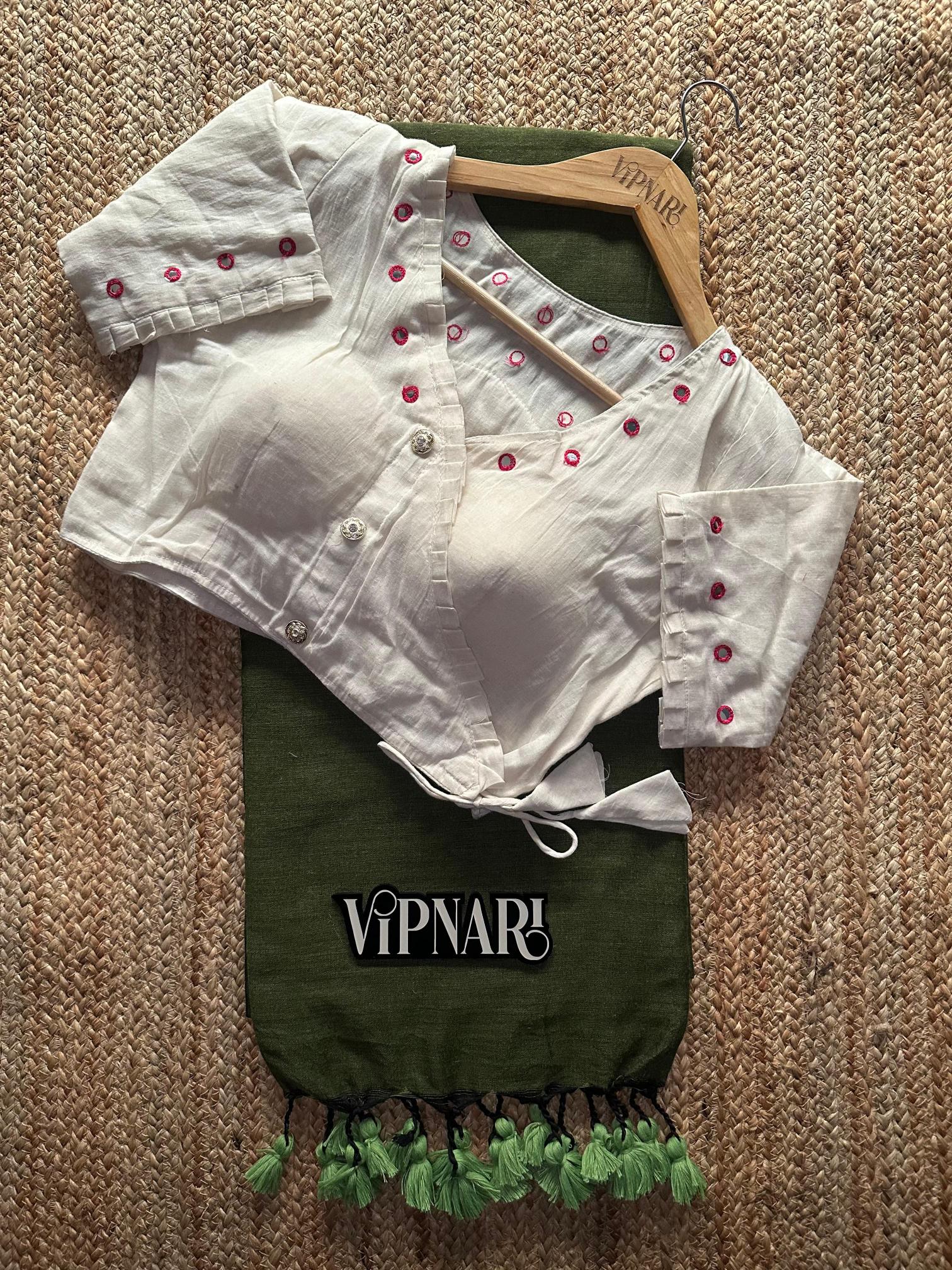 Crafted from premium handloom khadi cotton fabric, the blouse features intricate nature-inspired embroidery with florals, and detailed thread work along the lower bodice. Tiny floral butis scattered across the sleeves and chest add to its charm.