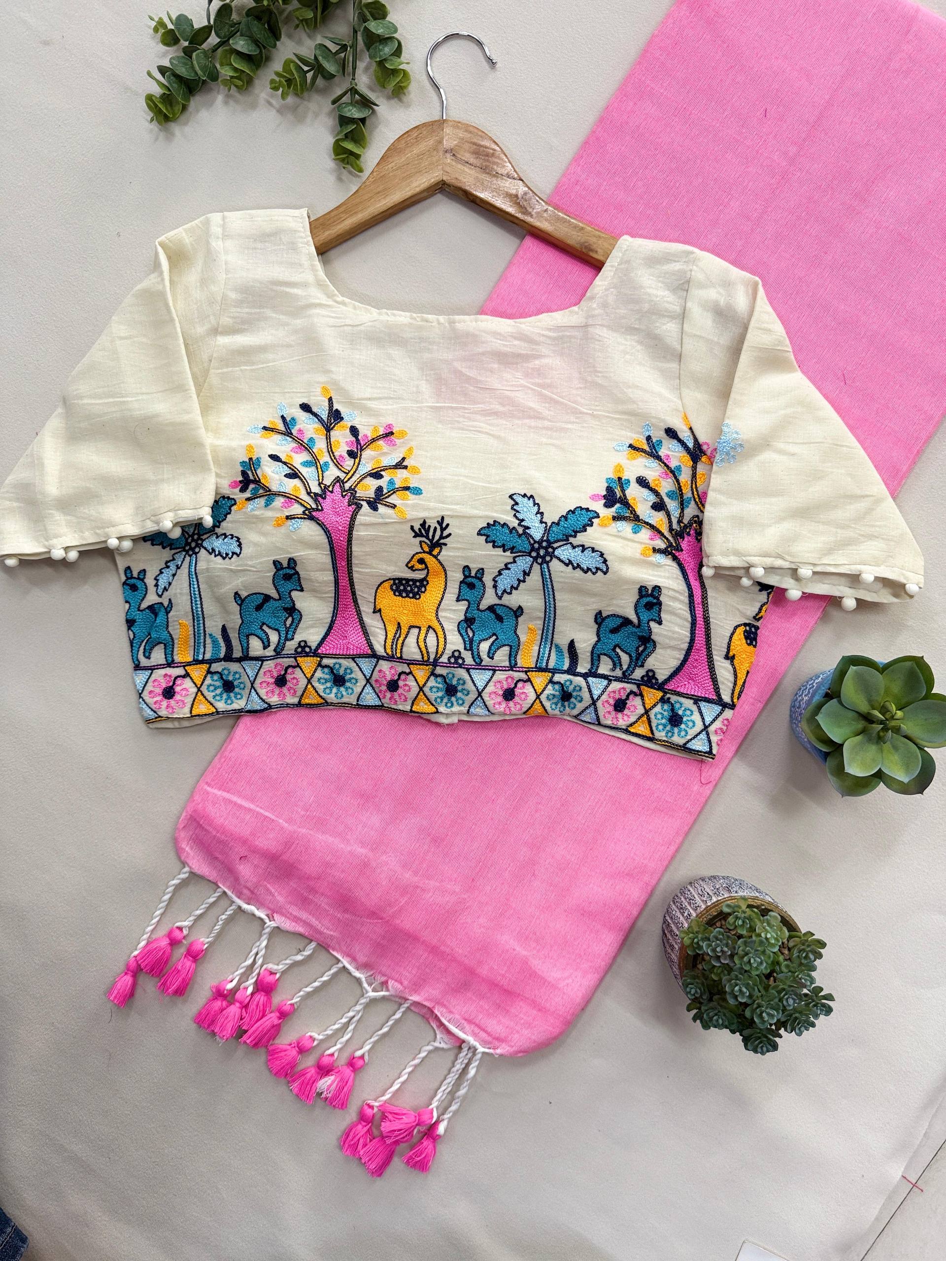 Pure Khadi Cotton Saree With Stitched Embroidery Blouse
