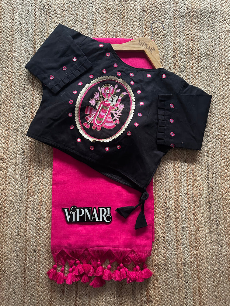 Crafted from premium handloom khadi cotton fabric, the blouse features intricate nature-inspired embroidery with florals, and detailed thread work along the lower bodice. Tiny floral butis scattered across the sleeves and chest add to its charm.