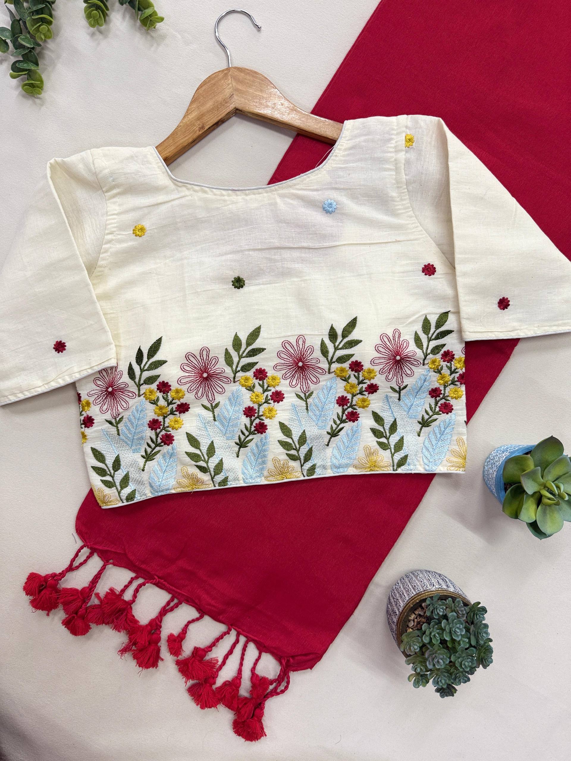 Crafted from premium handloom khadi cotton fabric, the blouse features intricate nature-inspired embroidery with florals, and detailed thread work along the lower bodice. Tiny floral butis scattered across the sleeves and chest add to its charm.