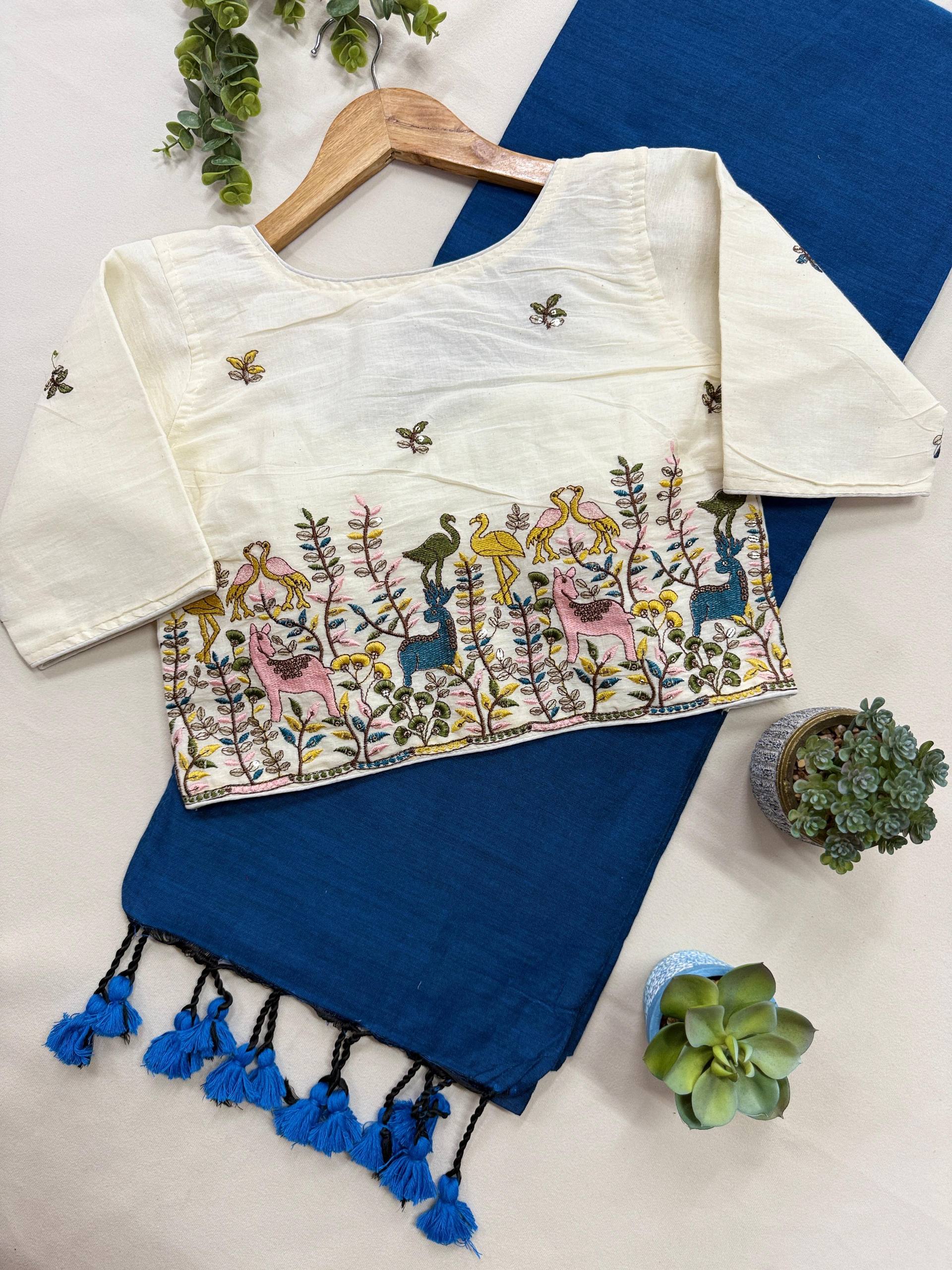 Royal Blue Pure Handloom Cotton Saree With Stitched Handwork Blouse