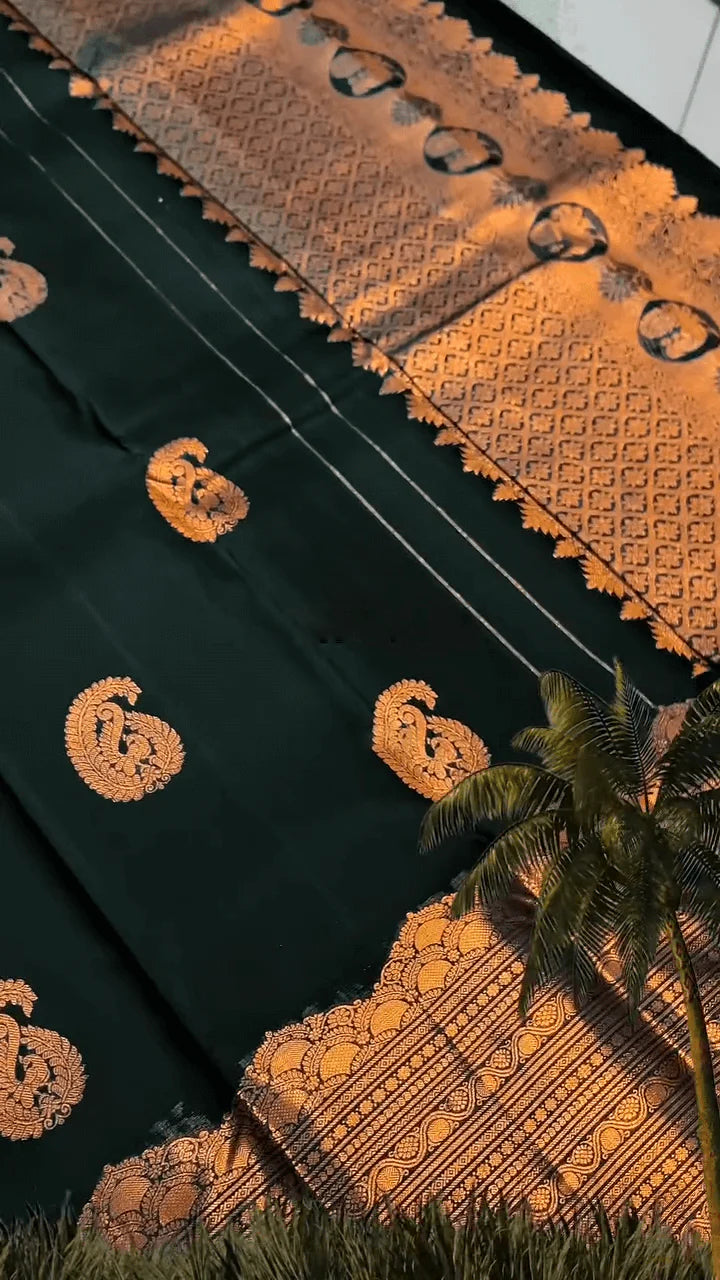 Very Engaging Dark Green Soft Banarasi Silk Saree With Gorgeous Blouse Piece