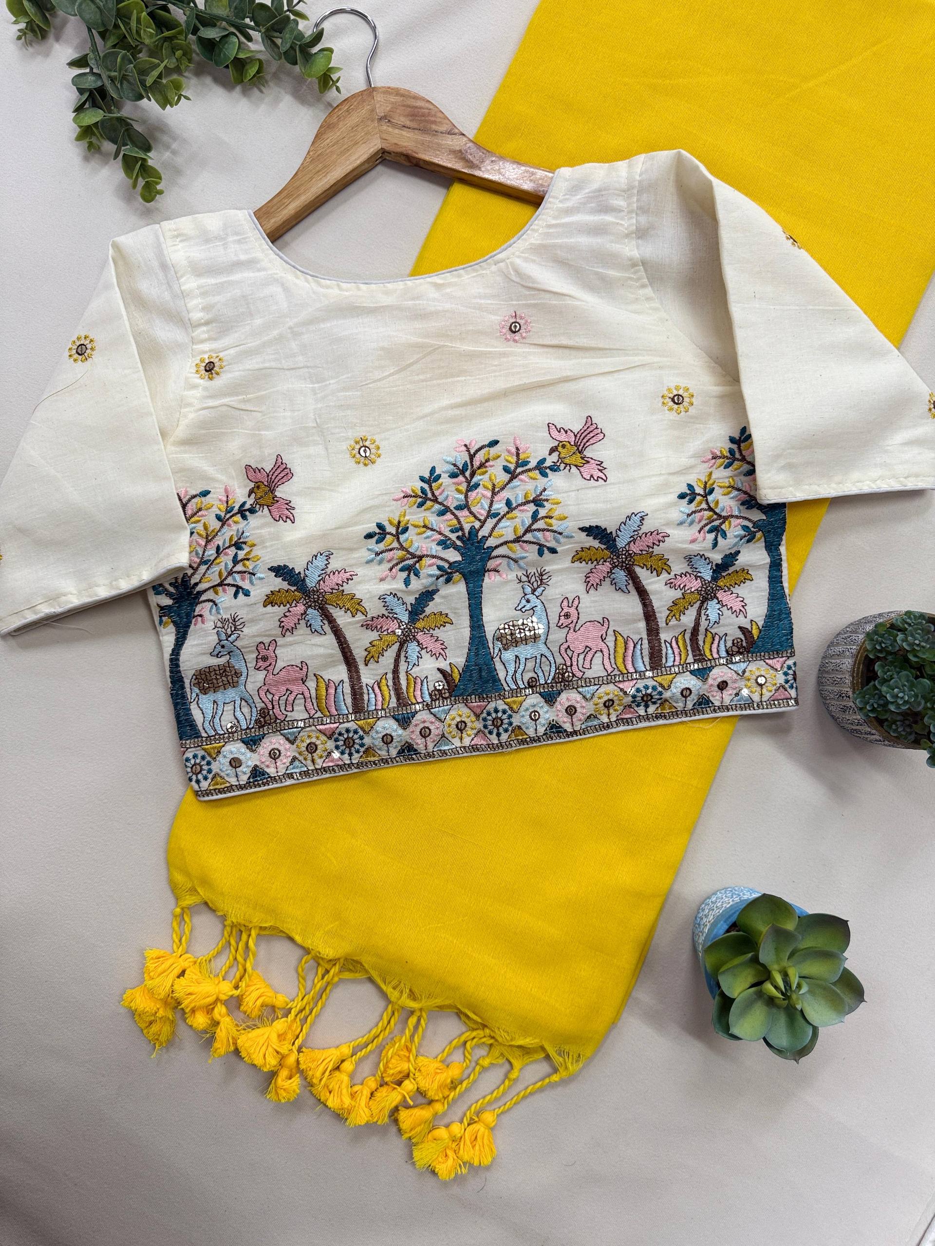 Yellow Pure Handloom Cotton Saree With Stitched Handwork Blouse